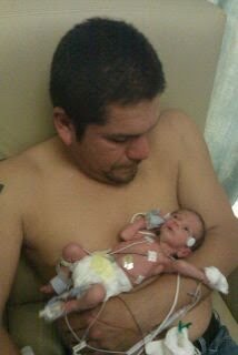 Devin is totally blowing eeryone away. His daddy got to hold him in what is called kangaroo care. It's where Memo (or me) takes off his shirt and then holds the kids against their chest. Devin LOVED it. he kept looking around and just snuggled right in